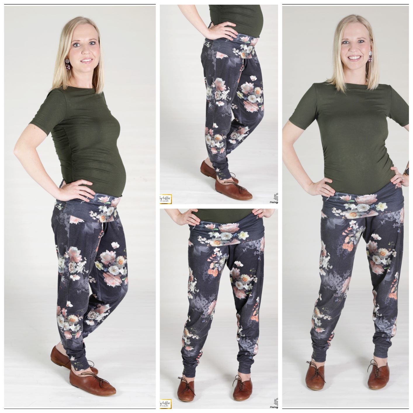 - Chillax Track pants – loose fitting around bum and hip area cuffed at the ankle, these pants are finished off with a thick fold over band at the top, band can be worn over a pregnant belly